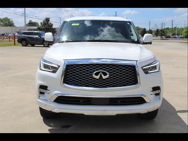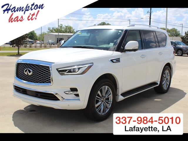 Experience luxury and power with the Moonstone White 2022 INFINITI QX80 Luxe SUV. Featuring a robust 5.6L V8 engine with 400hp and 413 ft-lbs of torque, this QX80 delivers smooth performance with rear-wheel drive and a 7-speed shiftable automatic transmission. Enjoy premium amenities like leather-trimmed upholstery, a heated steering wheel, Bose premium sound, and a 12.3-inch touchscreen with wireless Apple CarPlay and Android Auto. Safety is prioritized with adaptive cruise control, front and rear automatic emergency braking, blind spot monitoring, lane keeping assist, and a surround view camera system. Other standout features include a power moonroof, heated and ventilated front seats, power folding third row, self-leveling suspension, and navigation with real-time traffic. Stay connected with INFINITI Connection, onboard Wi-Fi, and SiriusXM in-car apps. This QX80 is designed to impress, offering comfort, advanced technology, and unmatched versatility for your daily drive or family adventure.